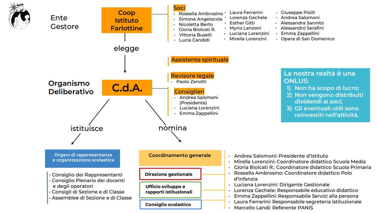 L’Istituto Farlottine ha la forma giuridica di cooperativa sociale (ONLUS) e gestisce le tre strutture educative di via della Battaglia 10 (Sede San Domenico), via Toscana 148 (Sede Santa Caterina) e via Berengario da Carpi 8 (Sede San Tommaso).