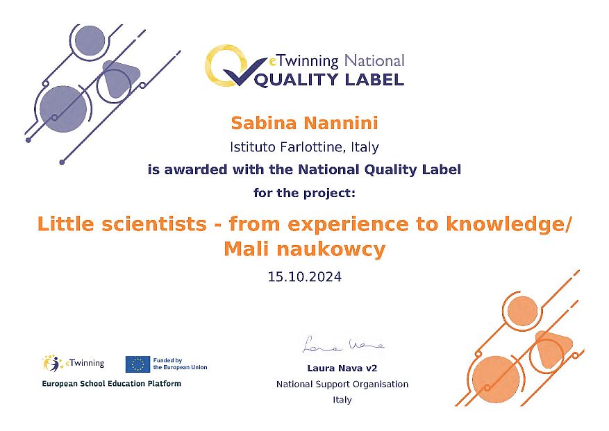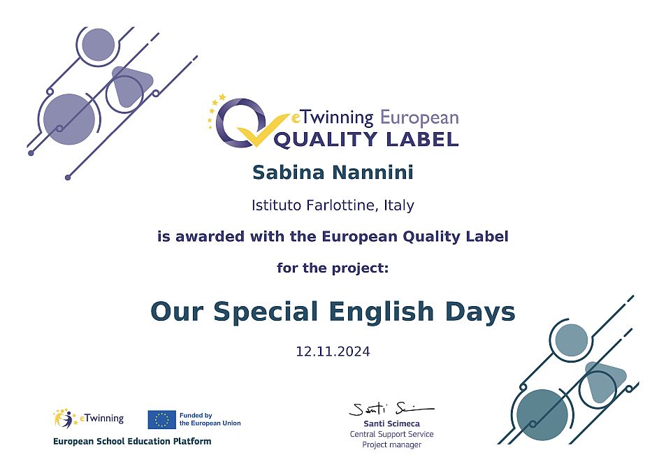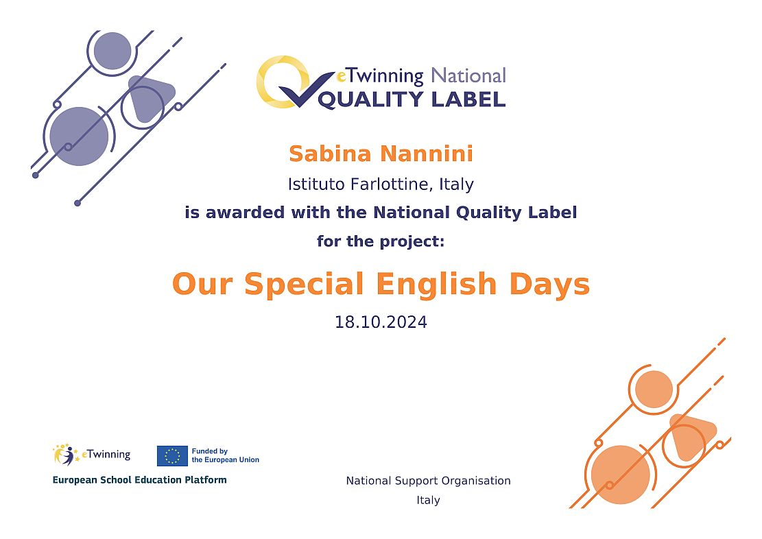 Il progetto Our Special English Days è stato insignito del prestigioso Premio Nazionale eTwinning 2024 per la categoria Infanzia, attribuito in occasione della Conferenza nazionale eTwinning a Genova, nel dicembre 2024. In tale contesto il progetto è stato presentato come buona pratica.