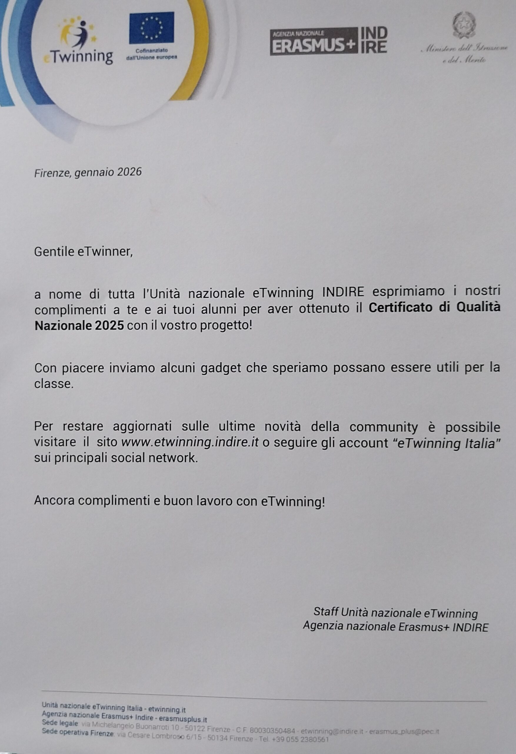 Il progetto Our Special English Days è stato insignito del prestigioso Premio Nazionale eTwinning 2024 per la categoria Infanzia, attribuito in occasione della Conferenza nazionale eTwinning a Genova, nel dicembre 2024. In tale contesto il progetto è stato presentato come buona pratica.