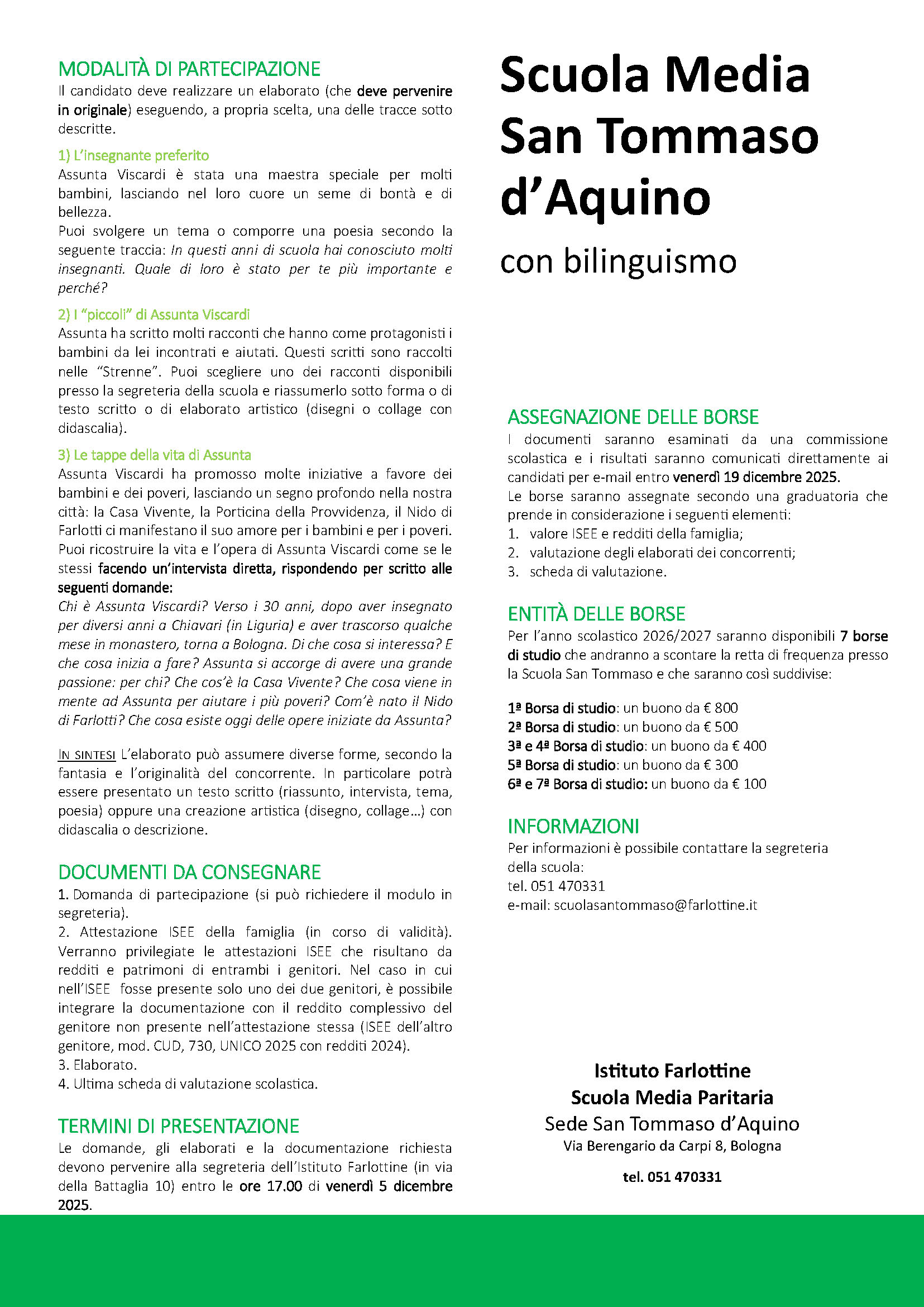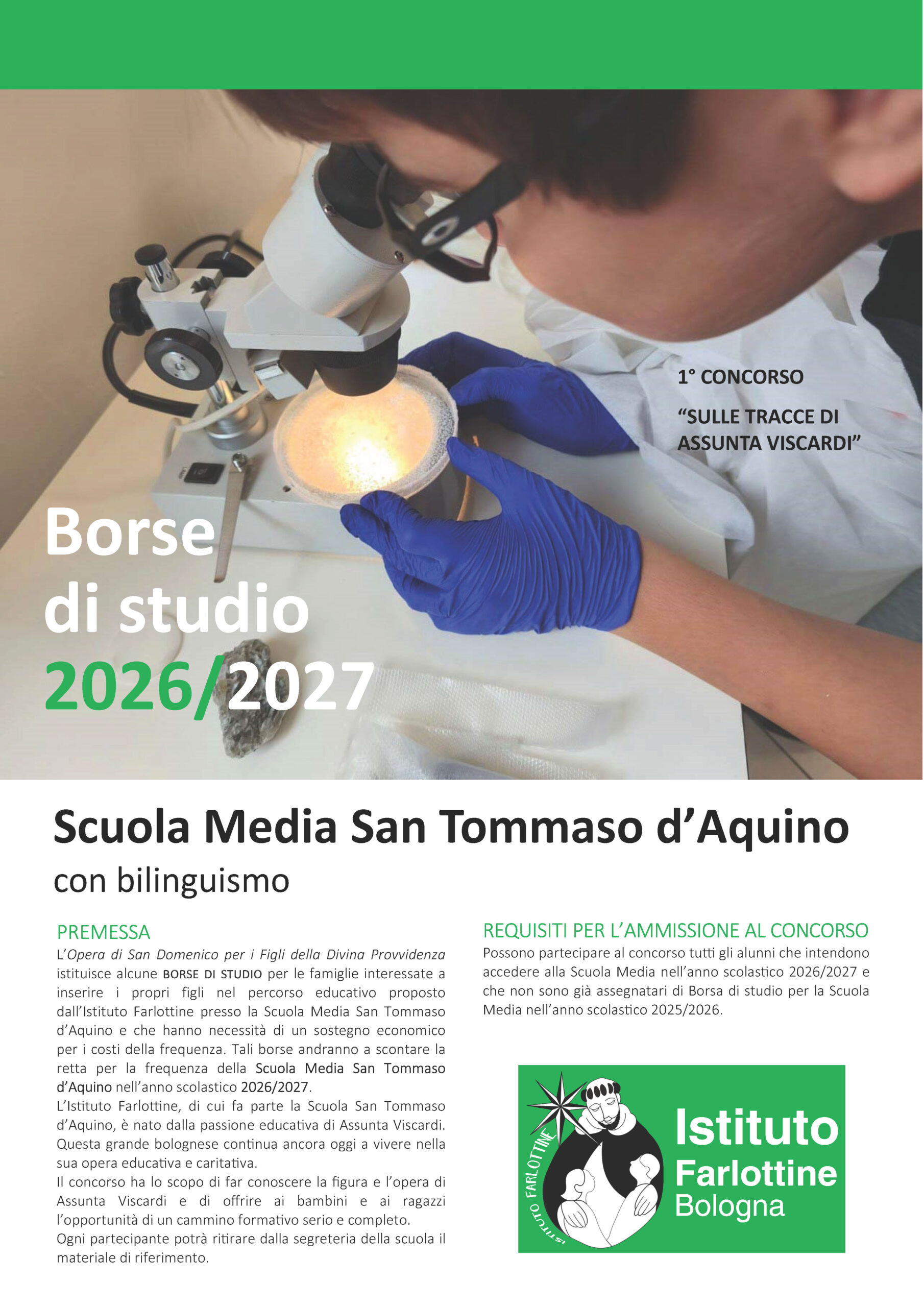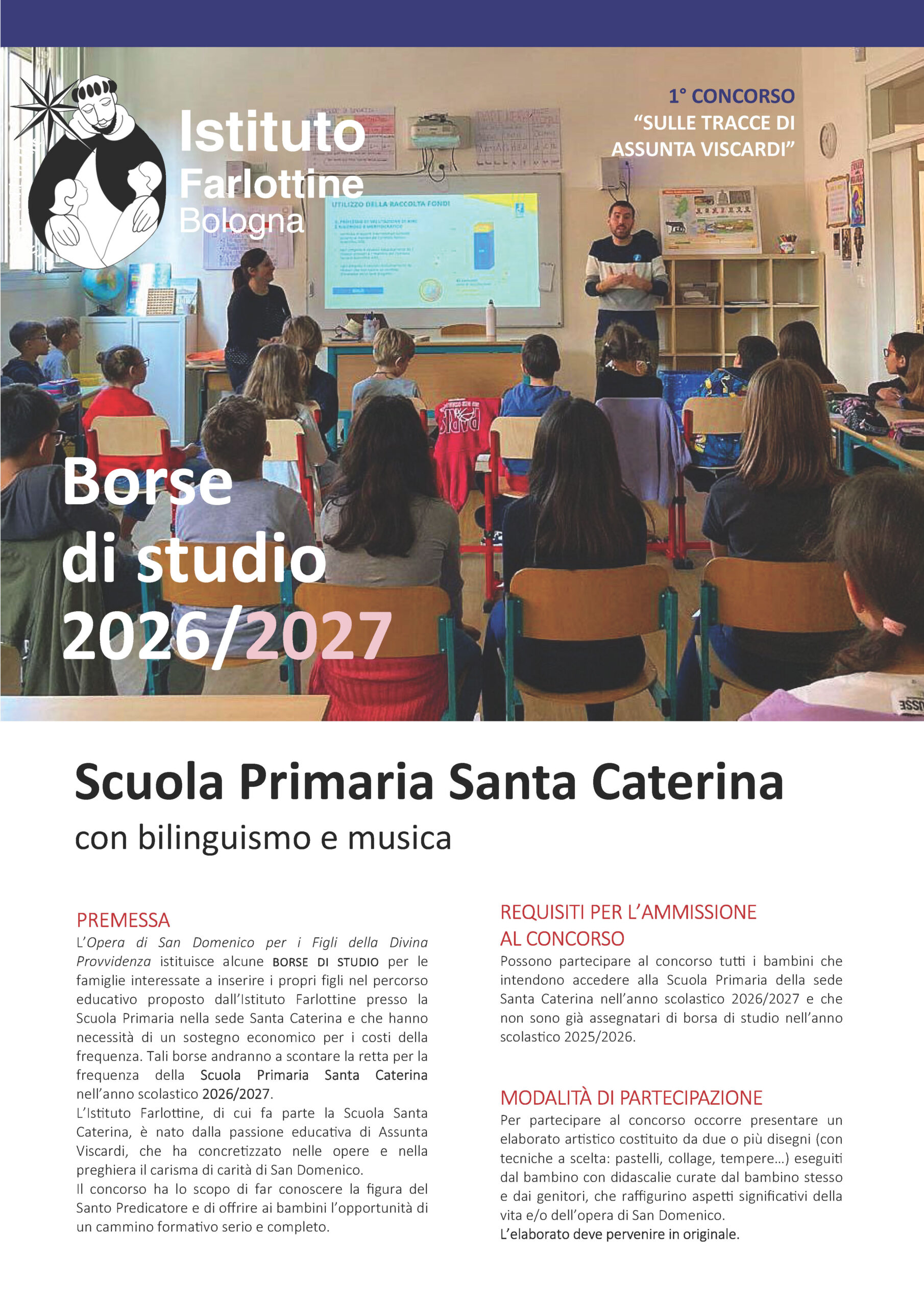 L’Istituto Farlottine è nato dalla passione educativa di Assunta Viscardi. Questa grande bolognese continua ancora oggi a vivere nella sua opera educativa e caritativa. Il concorso ha lo scopo di far conoscere la figura e l’opera di Assunta Viscardi e di offrire ai bambini e ai ragazzi l’opportunità di un cammino formativo serio e completo. Ogni partecipante potrà ritirare dalla segreteria della scuola il materiale di riferimento.
