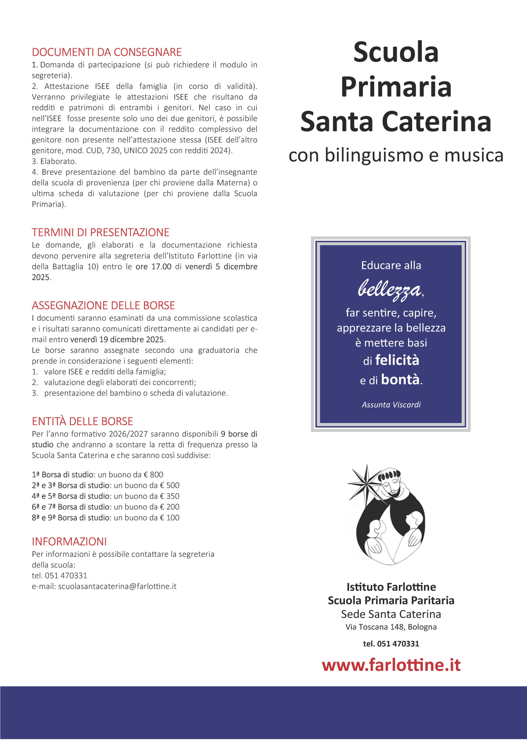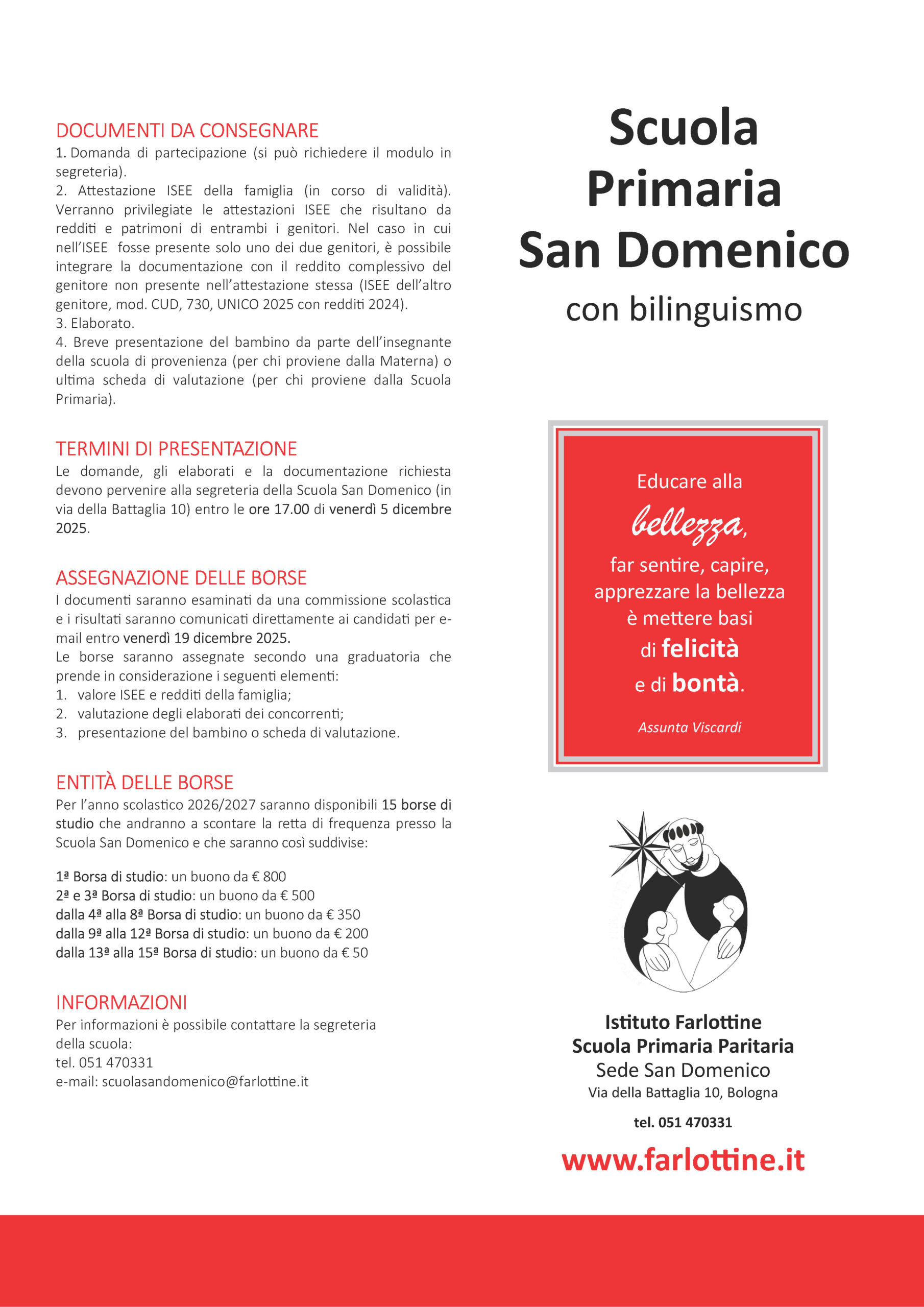 L’Opera di San Domenico per i Figli della Divina Provvidenza istituisce alcune borse di studio per venire incontro alle famiglie che sono in difficoltà economica per il perdurare della crisi economica o per altri motivi.